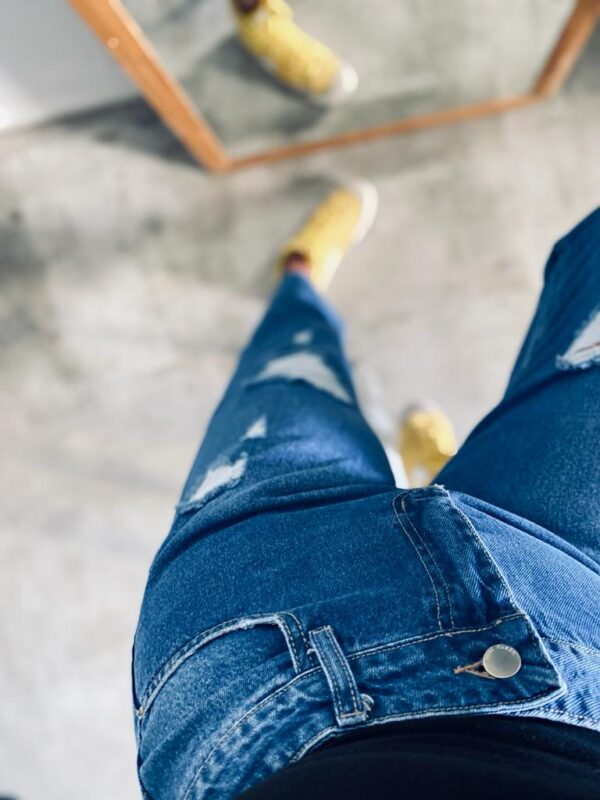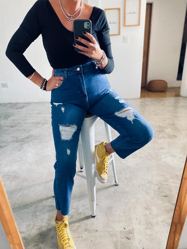 Descripción: Pantalón Jean Momfit Con Rotura y Ruedo Cortado